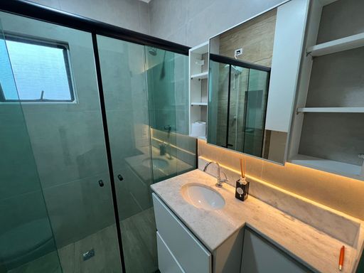 O banheiro social apresenta um design contemporâneo, proporcionando funcionalidade e elegância. A cozinha, equipada para atender às suas necessidades diárias, e a área de serviço complementam o layout inteligente deste imóvel.