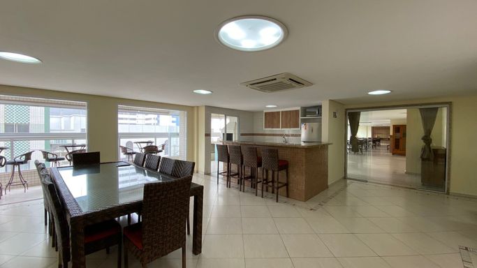 O imóvel conta com 3 dormitórios, sendo 1 suíte, sala para dois ambientes, cozinha americana planejada, sacada gourmet envidraçada, lavabo, área de serviço e dois banheiros (social e de serviço). Possui 2 vagas de garagem.