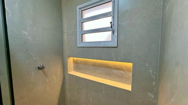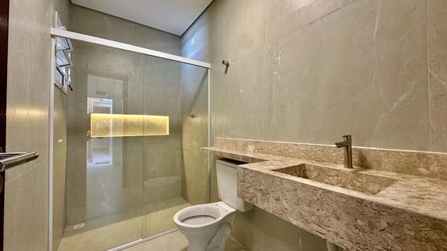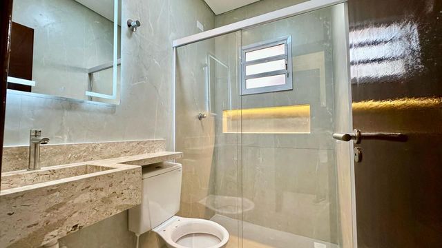 Possui 2 dormitórios, ambos suítes, além de lavabo, cozinha americana e infraestrutura para ar-condicionado. Os banheiros contam com box instalados e nichos com iluminação em LED, proporcionando um toque moderno e funcional. A casa dispõe ainda de 2 vagas de garagem amplas e acabamento de alto padrão, com porcelanato Elizabete no formato 74 x 74, garantindo sofisticação e durabilidade.