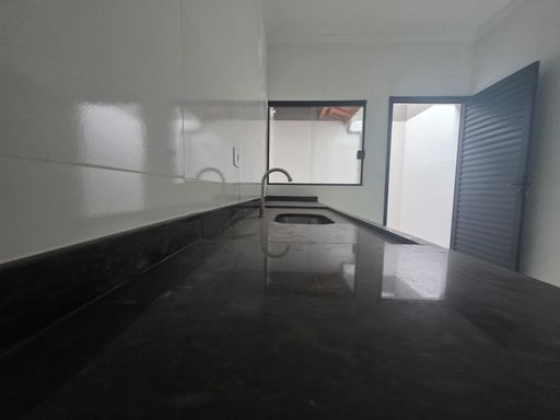 A construção apresenta acabamento de alto padrão, com piso interno em porcelanato, detalhes em granito e parte externa com textura e tinta impermeável. O telhado é composto por telhas resinadas com calha, oferecendo maior durabilidade. As janelas, portas e corrimão são em alumínio preto, agregando elegância e resistência ao imóvel.